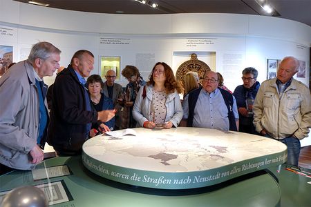 Ein weiteres Highlight an diesem Tag war die Fahrt mit der Rietbergbahn hinauf zur Ruine Rietburg, der einzigen Pfälzer Burg, die per Sessellift zu erreichen ist. Von der Aussichtsterrasse aus genoss die Gruppe den Blick in die Rheinebene und auf die Weinberge der Südlichen Weinstraße. Zu Füssen der Rietburg befindet sich am Ostrand des Pfälzerwaldes ein markantes, nicht zu übersehendes Bauwerk, nämlich Schloss Ludwigshöhe, die ehemalige Sommervilla des Wittelsbacher Königs Ludwig I. Eine Führung durch die Räumlichkeiten mit der ständigen Ausstellung der Werke Max Slevogts rundete diesen kulturellen Teil des Tages ab, bevor sich die Freunde zum gemütlichen Ausklang ins Hotel begaben.