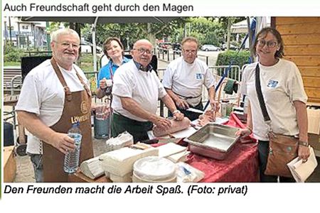 Der Erfolg gab ihnen recht: Es war gut, dass sie die alte Tradition zur gemeinsamen Standbetreuung mit den Amis d'Eberbach bei der „Foire de Crête" in Thonon Anfang September wieder haben aufleben lassen und den Menschen in Thonon ausgesuchte deutsche Spezialitäten kredenzten. Hier zeigte es sich wieder einmal, dass nicht nur Liebe durch den Magen geht, sondern auch Freundschaft. Den ganzen Tag über herrschte Hochbetrieb im Zeit der beiden Freundesgruppen, sowohl vor der gut bestückten Kuchentheke als auch am Stand mit Deftigem bildeten sich lange Schlangen. Die Freude am gemeinsamen Arbeiten sah man den beiden Freundesgruppen an, zumal noch ein Akkordeonspieler für gute Stimmung sorgte.