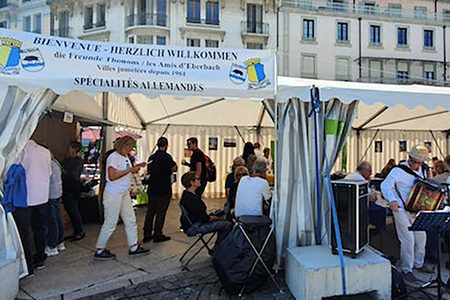 Anlässlich der „Foire de Crête“ in Thonon, dem traditionsreichen Bauernmarkt, der für einen Tag sprichwörtlich die ganze Stadt beherrscht und eine Vielzahl von Menschen rund um den Genfer See anlockt, reisten rund 30 Freundinnen und Freunde Thonons in die Partnerstadt, um dort gemeinsam mit den französischen Freunden in einem Festzelt Eberbacher Lebensart zu zeigen und bei deutschem Bier, Eberbacher Bratwurst und selbst gebackenem Kuchen Kontakte mit der Bürgerschaft zu knüpfen, Freunde und Bekannte wiederzutreffen und die Stadt Eberbach vorzustellen.