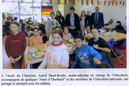 À cette occasion, les restaurants scolaires de la ville se sont parés ce vendredi des couleurs noir, rouge et jaune. Au menu des 1.100 écoliers demi-pensionnaires du jour : linsensuppe (soupe de lentilles sans viande), gelflügelwurst mit curry (saucisse de volaille au curry), knoedel, munster, birmenkuchen und würzige schokolade (gâteau poire-chocolat aux épices): un agréable moment où la gastronomie a servi de support à l'histoire. Il est à noter que depuis cette année, un professeur initie les élèves de trois écoles à la langue allemande. (Jacky CARRILLAT)
